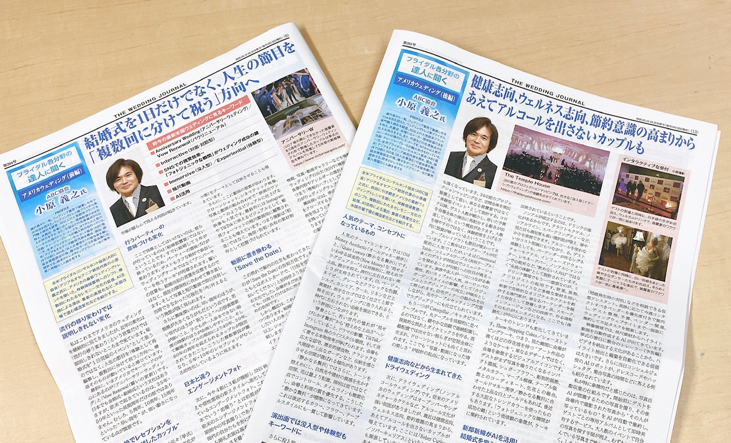 弊社代表・小原が、ウェディングジャーナル新聞(2/10・2/25号/3/10・3/25号)にて、米国ウェディングの最新トレンドを連載でご紹介しています。